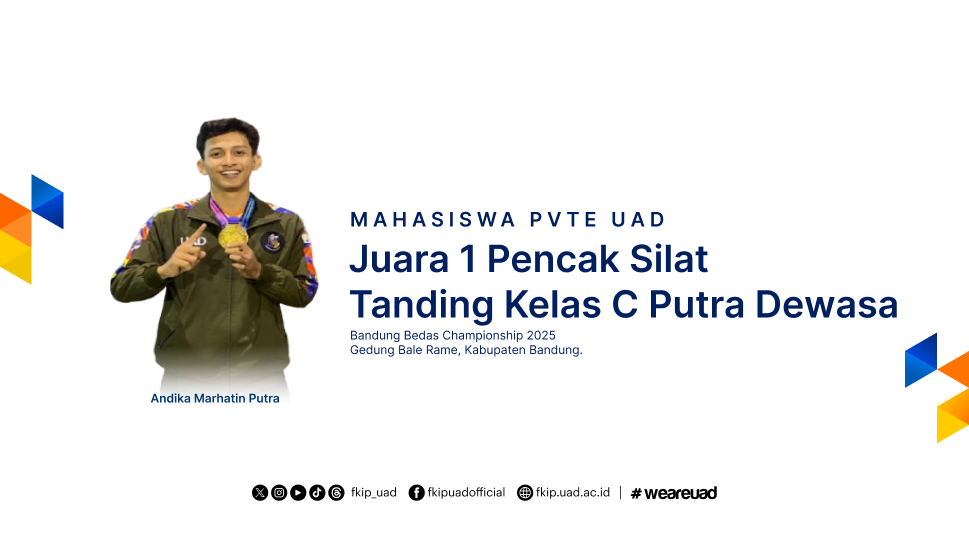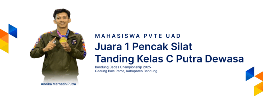 Mahasiswa Program Studi Pendidikan Vokasional Teknik Elektronika (PVTE) FKIP UAD, Andika Marhatin Putra, berhasil meraih Juara 1 Kategori Tanding Kelas C Putra Dewasa pada ajang Bandung Bedas Championship 2025. Kejuaraan pencak silat bergengsi ini digelar di Gedung Bale Rame, Kabupaten Bandung, dan menghadirkan pesilat terbaik dari berbagai daerah di Indonesia.